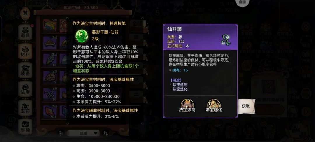 三阶法宝推荐仙羽藤,不仅造成法术伤害,还能偷敌人的攻击属性,对于副s输出的司空来说很搭。