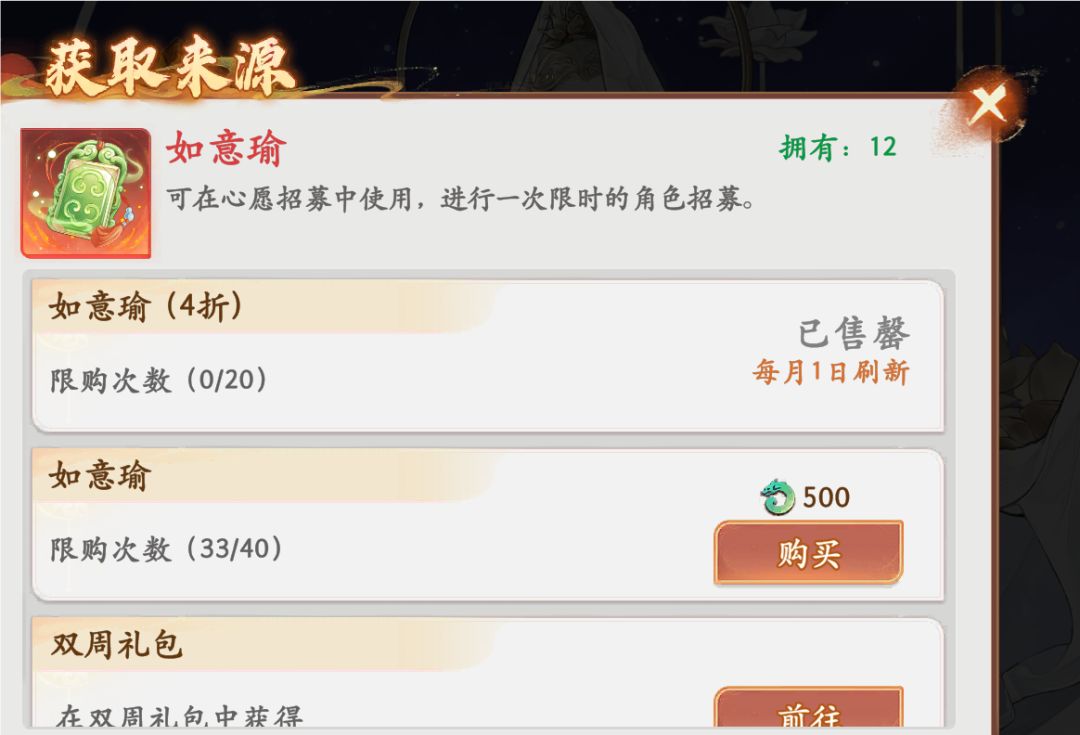 如意瑜,即抽取心愿池需要使用的道具,每个月限购为60抽。