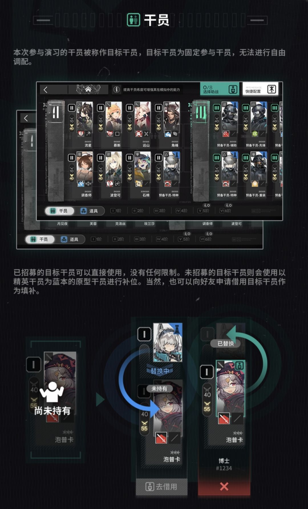 这个模式可出战的干员和肉鸽是基本一样的,包括三种你自己有的,预备干员,以及借好友的,
