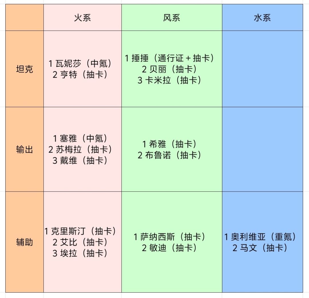 风队这个版本可用的英雄不算太多,但是勉强能组队的。风队的优点是基本不需要氪,比较亲民。缺点是强度一般。