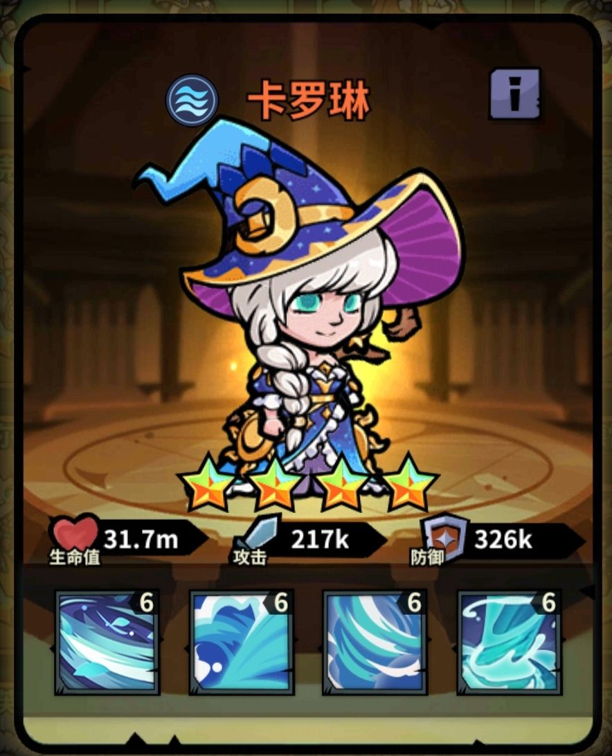 卡罗琳是水系输出法师,通行证英雄。他的亮点可以群控晕人,在满星满CD的情况下实现6秒晕2.4秒的强控制。但是在低星状态下,这个控制技能CD过长,控制时间过短,使用效果一般。