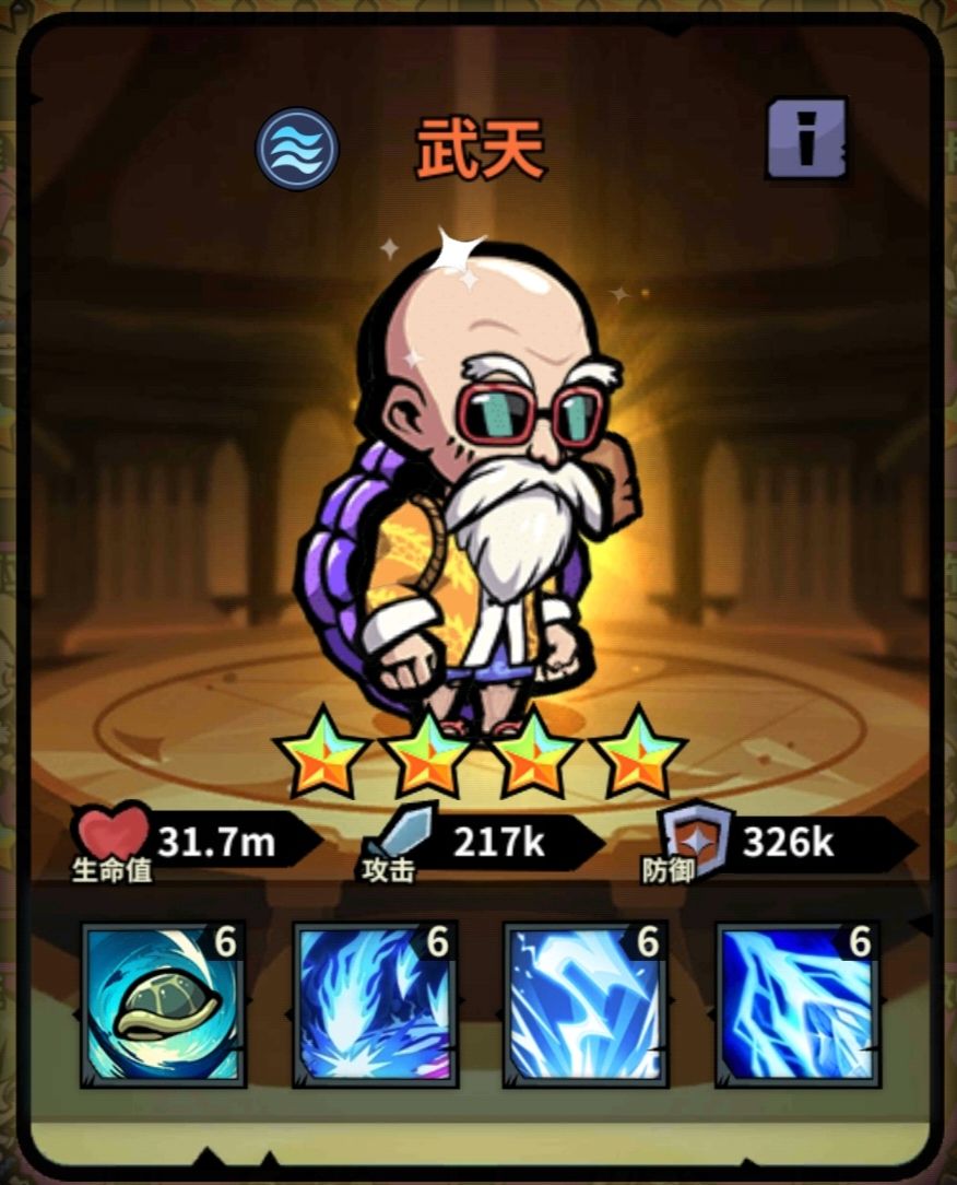 武天老师估计坑了不少人,6元即可轻松入手,卡池出现几率还贼高,抽着抽着就高星了。但是你会发现他星级虽高了,输出一点没涨,低星刮痧,高星还是刮痧。武天老师唯一的作用可能就是用来爬塔了,这主要是因为前期水系实在是没啥英雄可用了。