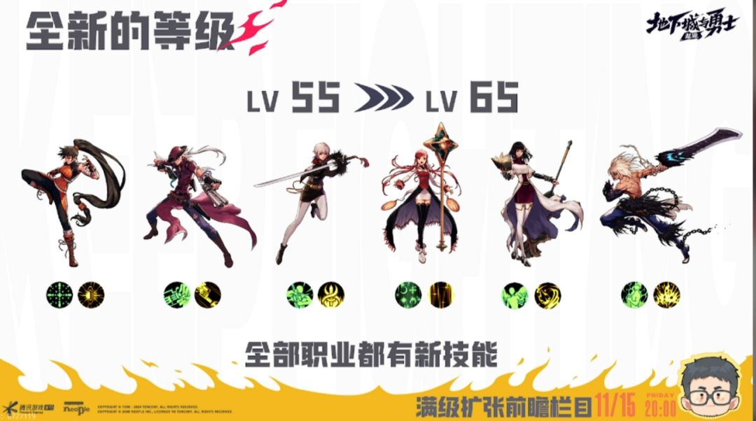 等级上限由55级扩张到65级,角色技能等级上限提升,觉醒技能可在增加两级,各职业新增65级主动技能以及一个被动技能,新被动技能都会优化现有职业的技能,例如鬼泣被动技能可使红绿阵变为跟随光环技能,漫游是减少溃灭射击的冷却时间,可大幅度提升玩家伤害