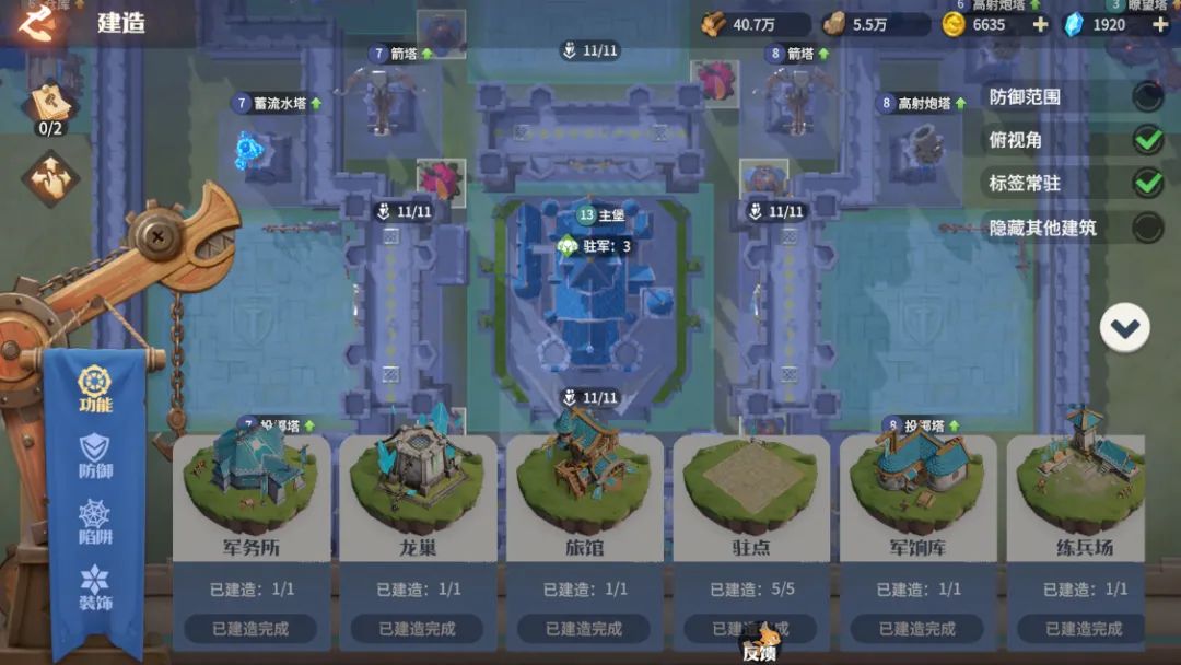 作为核心玩法之一的主城建筑,自然也是战力提升的主要渠道,根据建筑的功能与实际作归为以下三类:功能建筑、防御建筑、资源建筑。