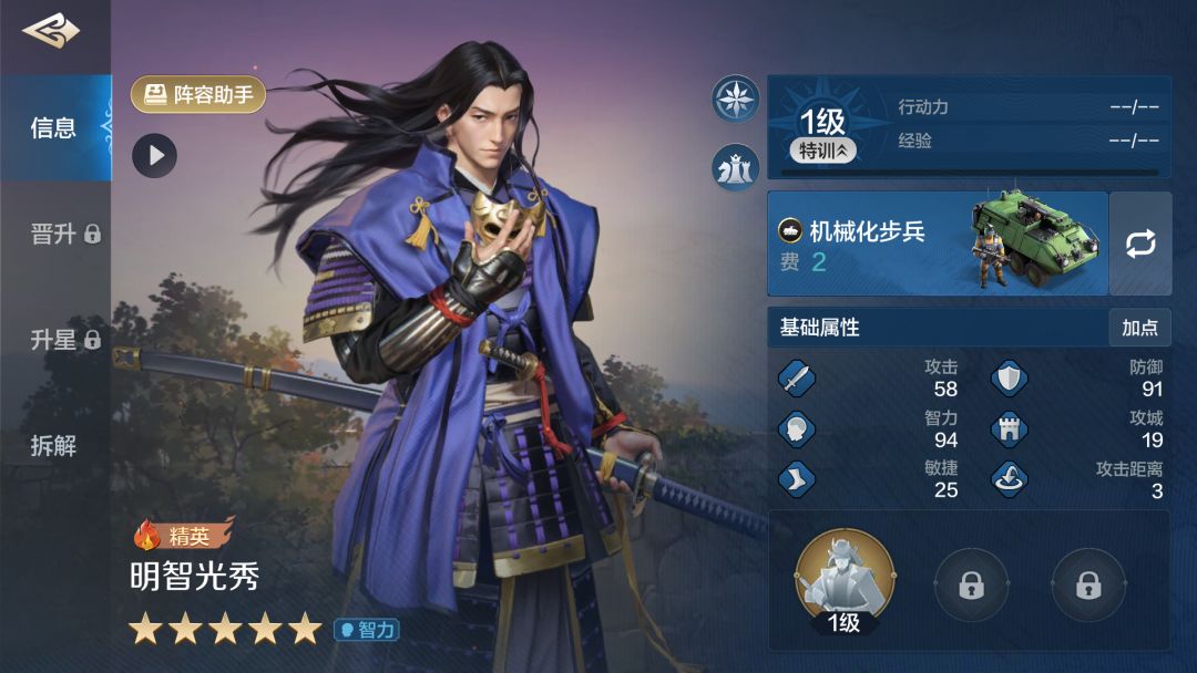 战斗思路:这队技能发动可以做到明智光秀一个技能击杀敌方统帅,但是容错极低。这队非常怕控制,虽然明智光秀有一定韧性,但是被控基本就输了,并且现在秦始皇都带先发,明智光秀敏捷不如秦始皇,容易被秦始皇控制导致容易翻车。建议专挑物理队、追击队、肉队打,第一回合放出技能基本就是秒杀。汉武帝和贞德可以只带100兵,明智光秀带满兵。