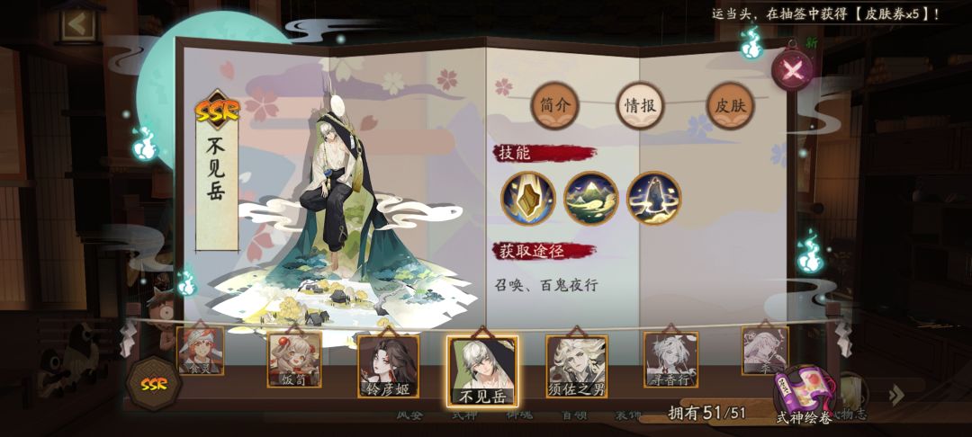 不见岳:先机增伤式神,同因幡组成因岳组合是爬塔等短线战斗通用解。但目前有龙吟铃鹿御前争就业,优先度下降。