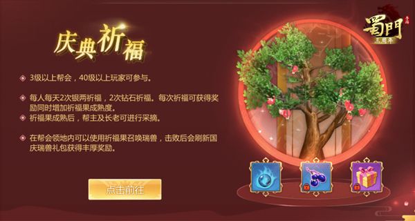 【全民祈福 采摘瑞果】在活动期间,3级以上帮会中40级以上玩家可以参与庆典祈福活动。同一帮会的成员每人每天拥有2次银两祈福和2次钻石祈福的机会。每次祈福可以获得奖励,同时增加祈福果的成熟度。当祈福果成熟后,帮主及长老可以进行采摘。