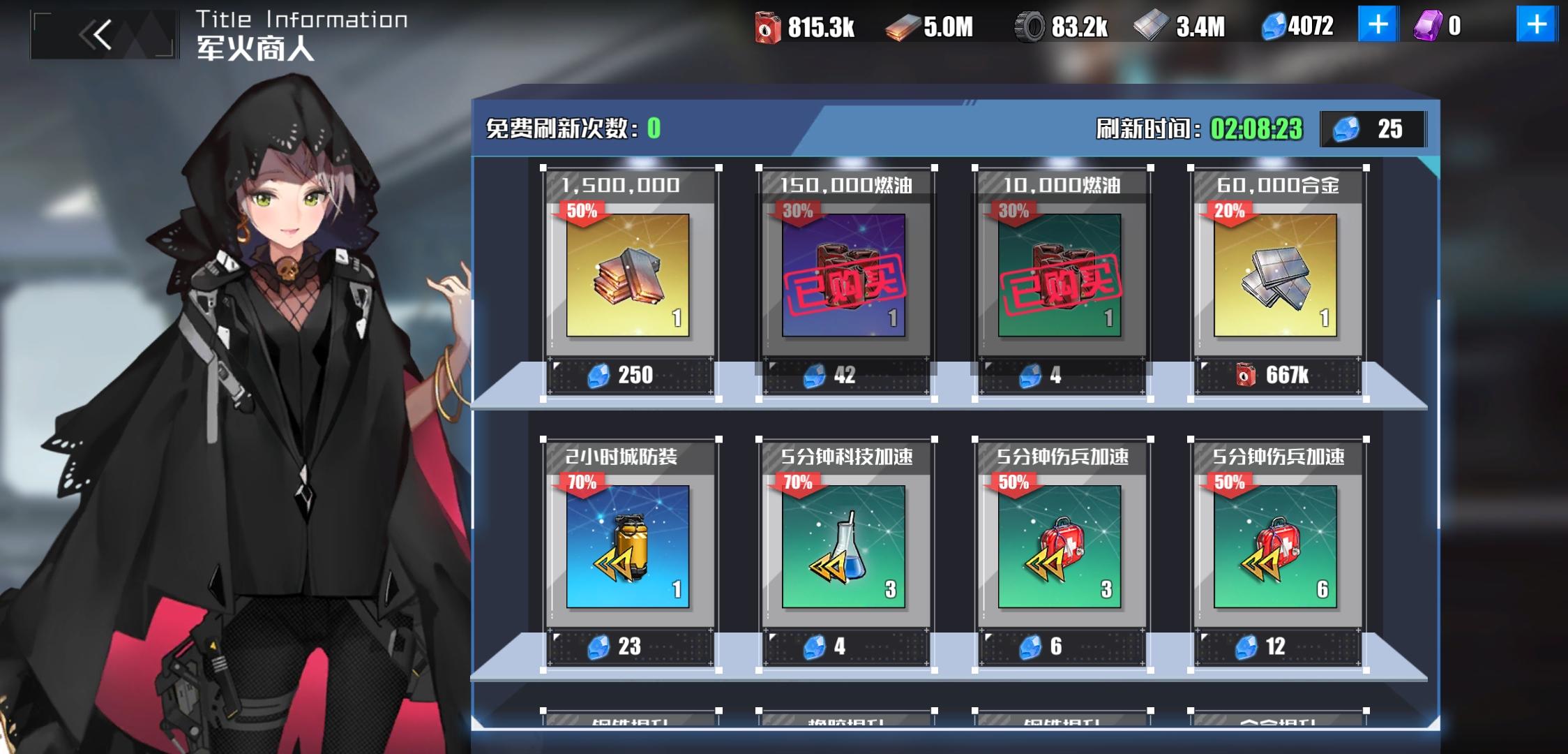 军火商人一天免费刷新两次,我推荐你刷到100钻单次,这里买资源非常的赚,无论是加速还是道具。
