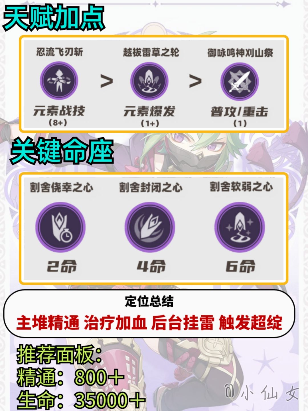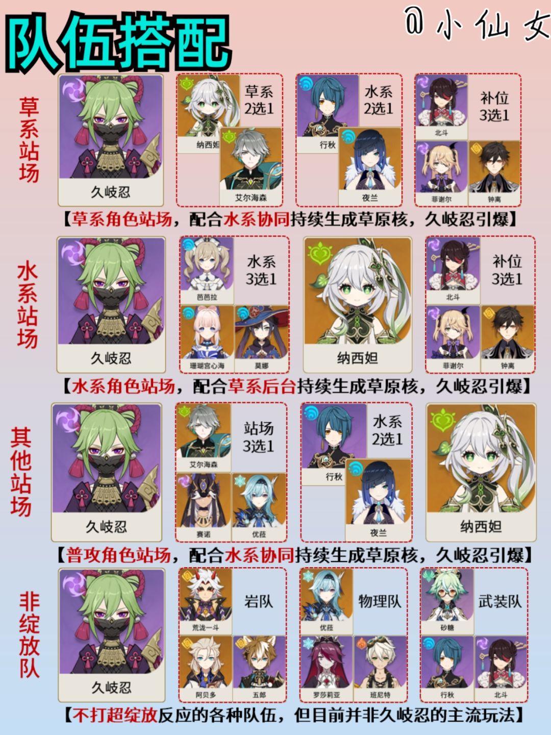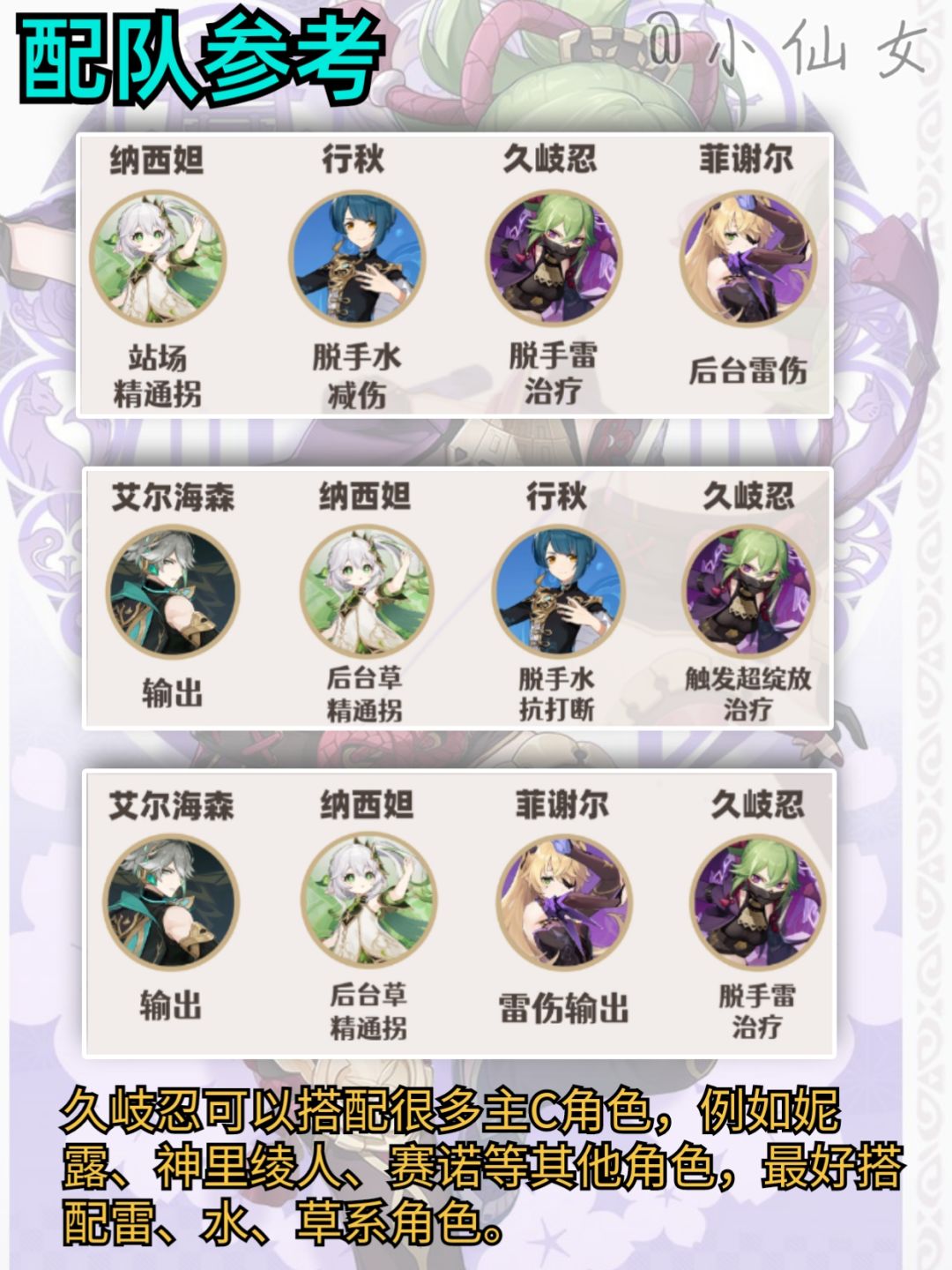 总结——久岐忍是一位具有随身治疗与范围雷伤、非常适合超绽放反应的角色,在须弥版本大热的种门队伍中能发挥非常重要的作用,同时0命就非常好用,有很多平民武器可以选择,常规玩法中需要主堆精通,所以凑齐圣遗物具有一定难度,而且角色等级非常重要需要尽量升到90级,但整体养成难度不高,主要依靠元素战技来进行治疗和触发反应,在大世界和深渊中都表现出色。「久岐忍」是一位兼具治疗能力与后台持续伤害的雷元素辅助型角色。