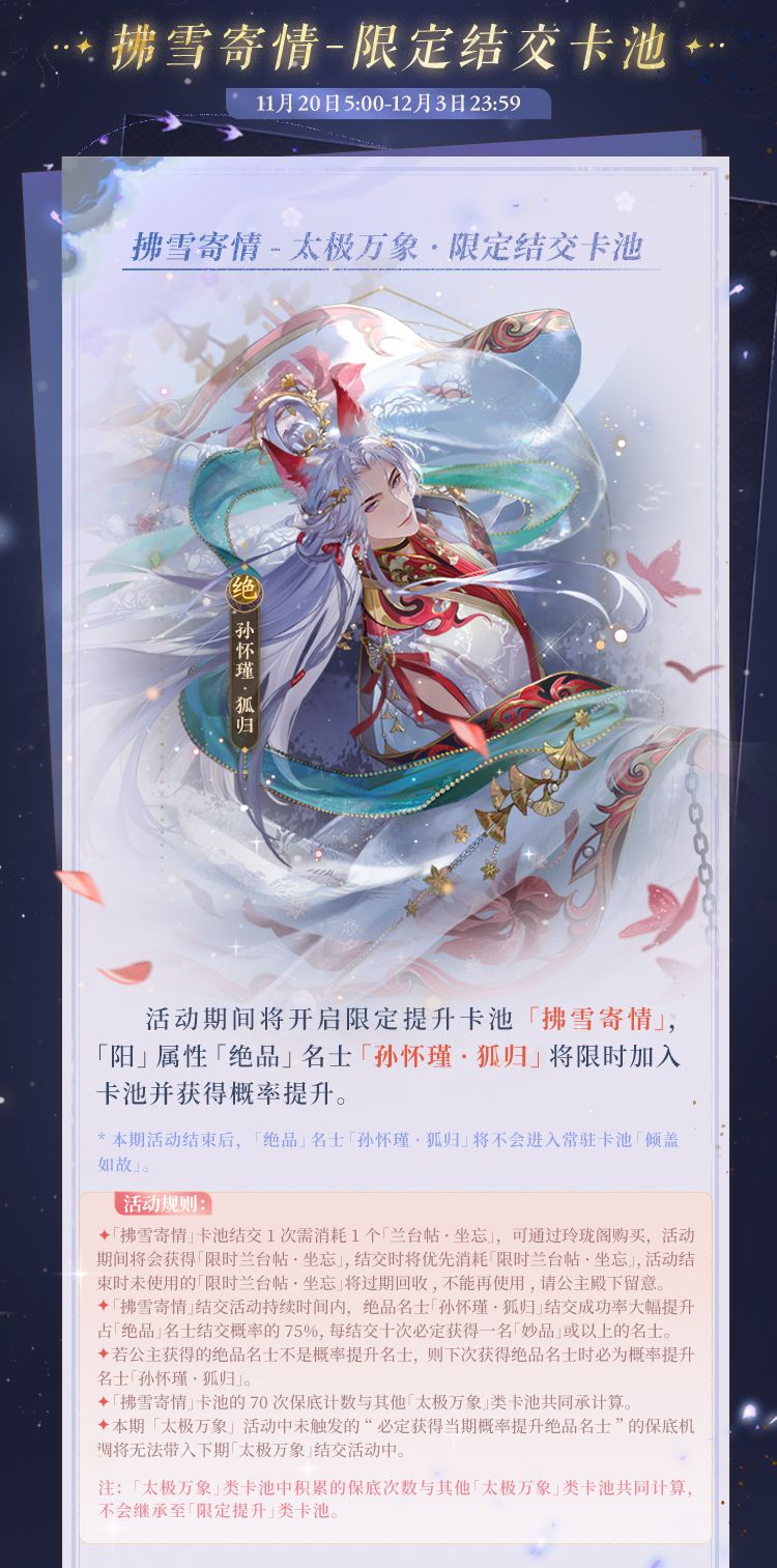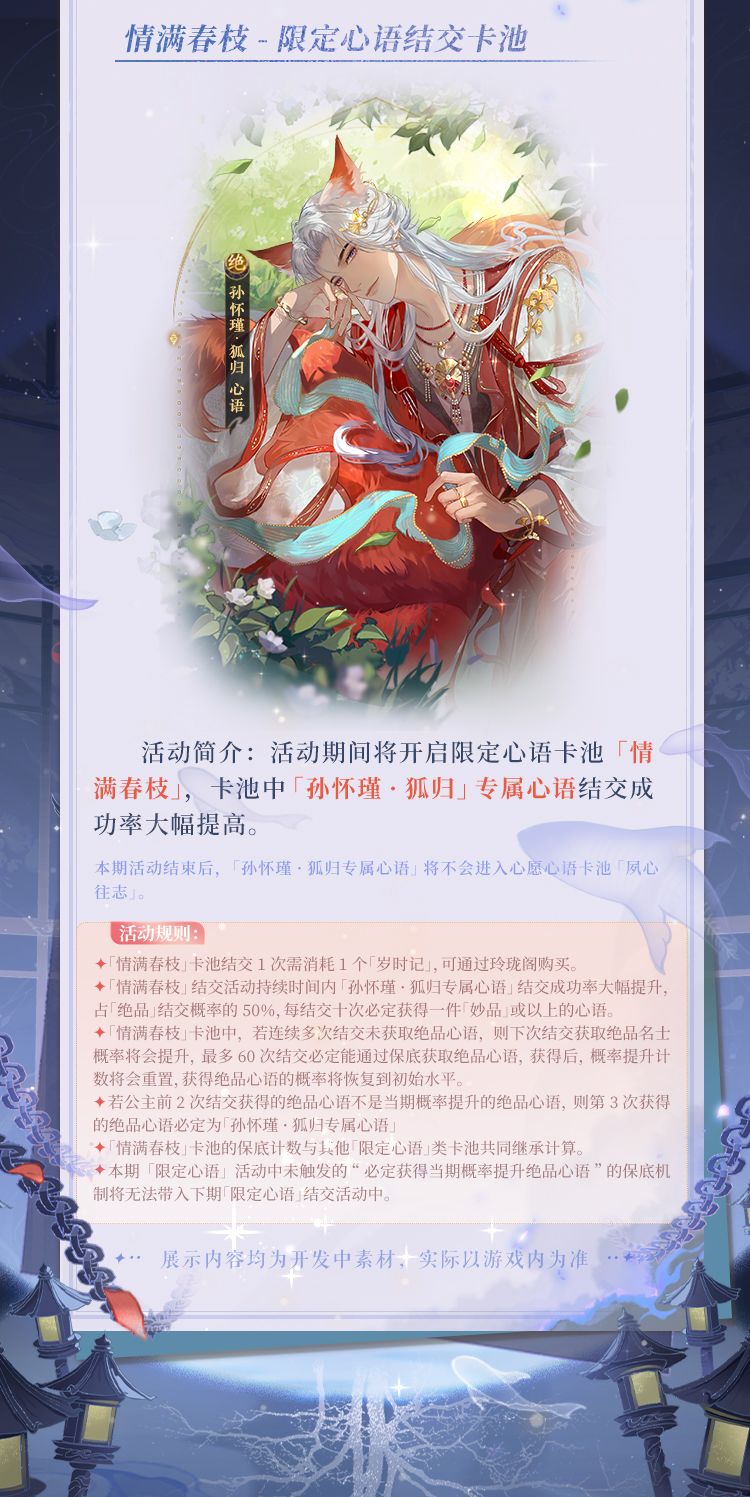 活动概要:活动期间「从一而终」探索玩法、「留痕照影」拼图玩法、「樊笼志异」活动关卡等精彩玩法,公主参与限时玩法可解锁活动剧情「春不晚」。收集活动道具「琼玖」,可以在活动商店「宝刹知春」兑换道具奖励。兑换当期 UP 角色「孙怀瑾·狐归」的专属心语。