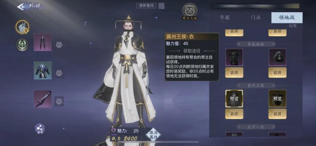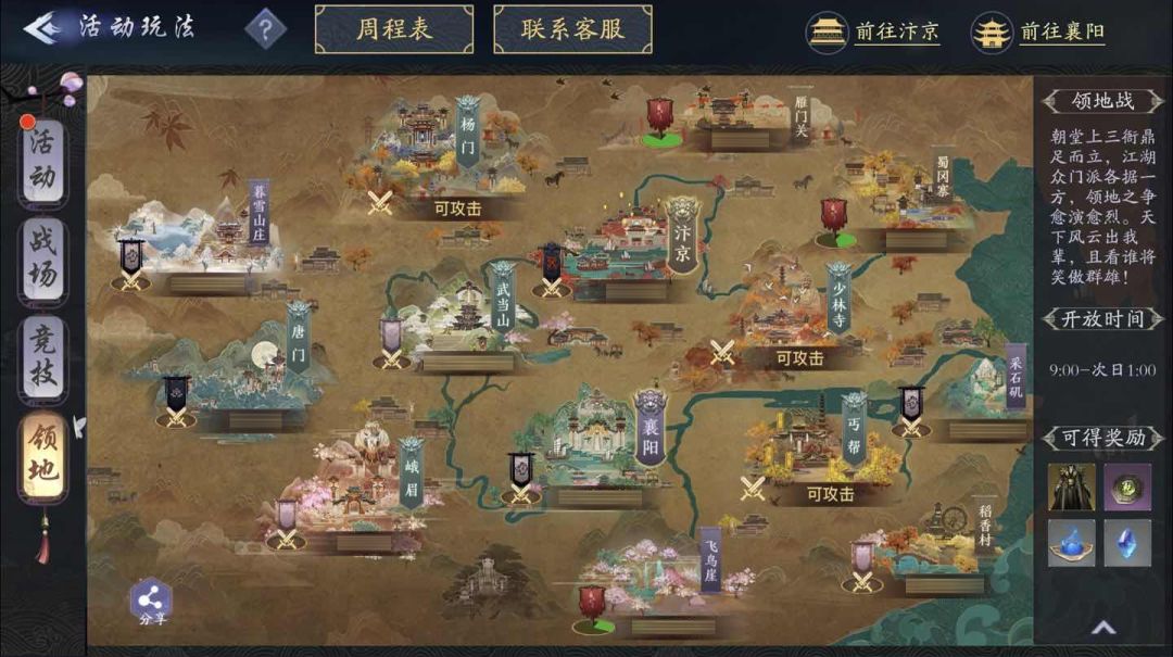 领地分为不同的等级,等级越高,奖励越好。最高等级的领地是主城汴京,其次是主城襄阳,然后是各大门派和野外地图。