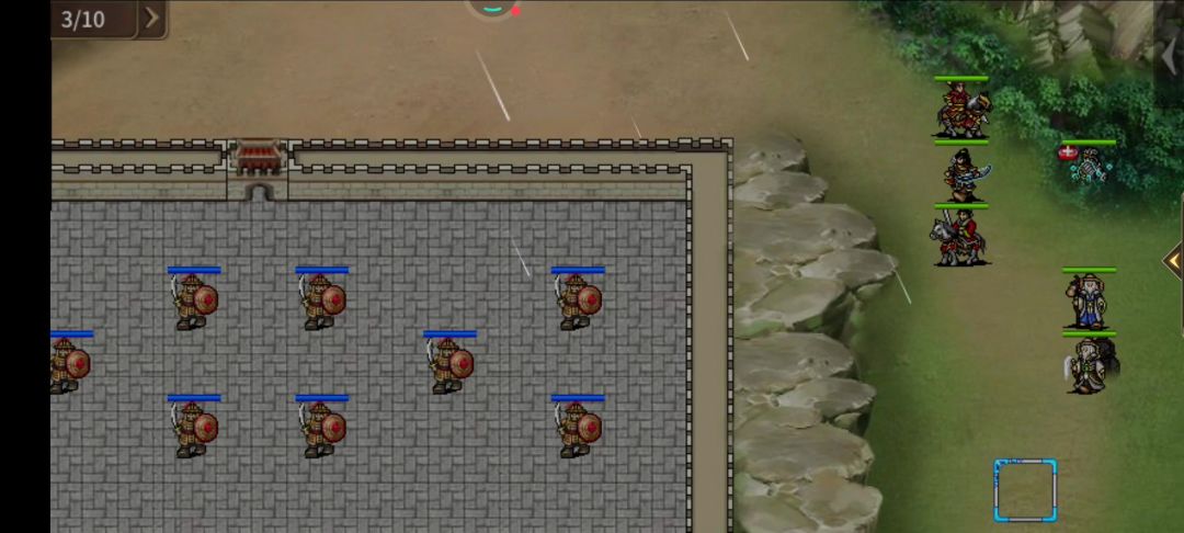 和上回合一样,诸葛通过走位把虎步打出不屈,因为这里马超没有带嘲讽装备,担心弓骑跑上来打人,所以操作稍微繁琐了一点。然后马超快速移动到能让剩下的弓骑全部打到的位置就可以了。