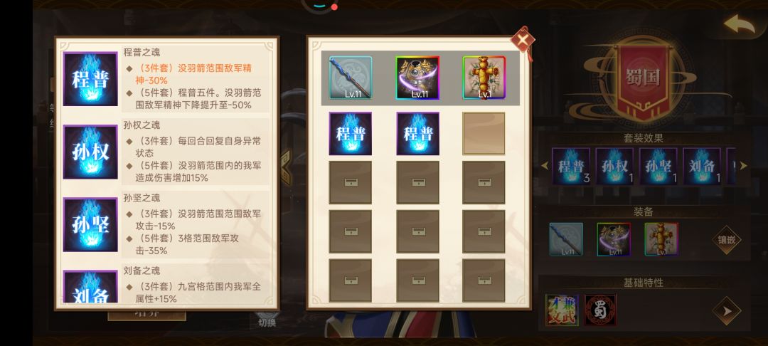 蓝色铁脊蛇矛自带中毒攻击,给中毒阈值的敌军挂状态的,金丝甲全屏反击,飞将先手,稻草人嘲讽,3程普能降低敌军30%精神,给诸葛增加输出。