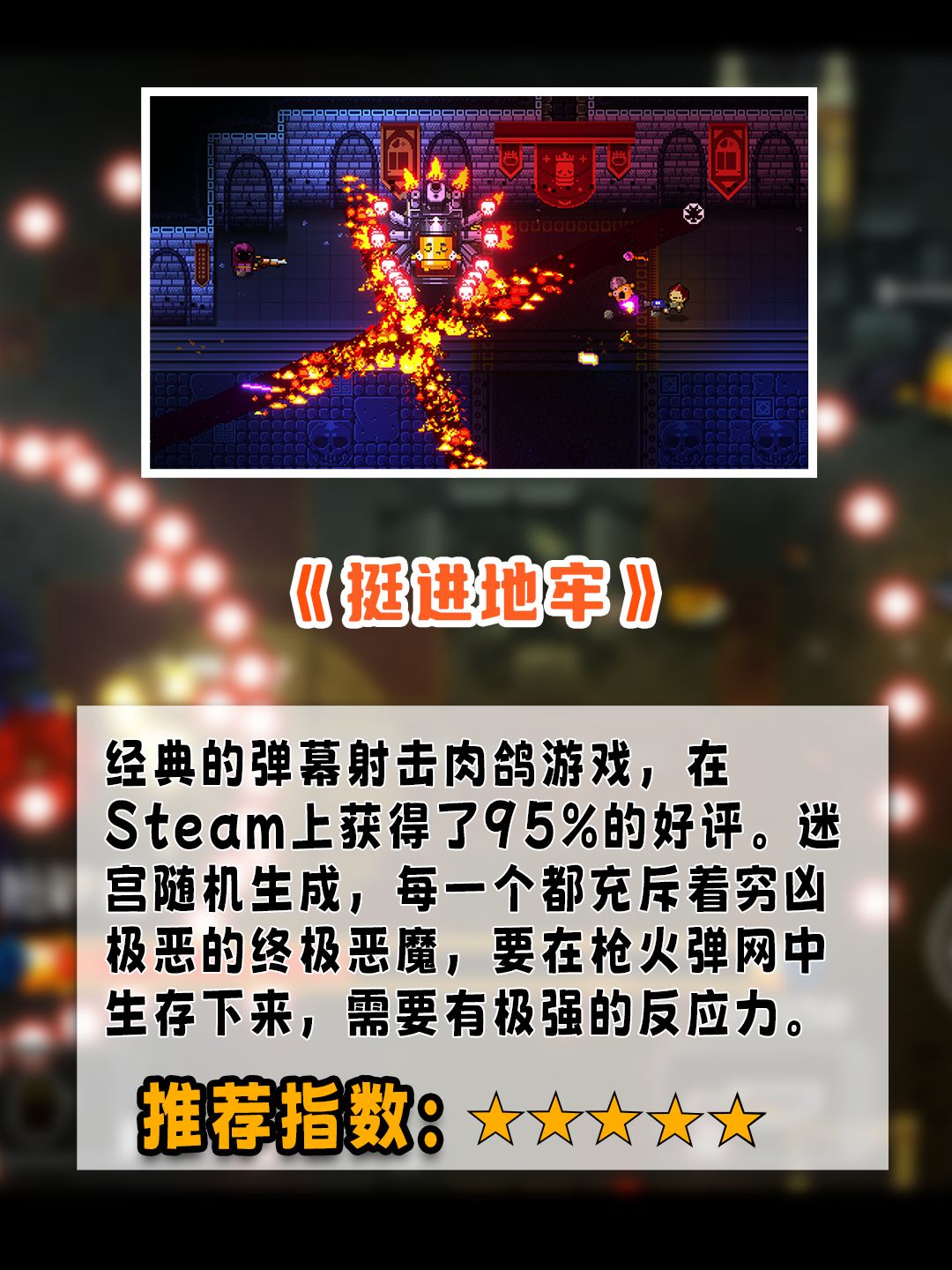 经典的弹幕射击肉鸽游戏🕹️,Steam95%好评。迷宫🔍随机生成,大量枪械🔫道具,背包容量不限🎒。