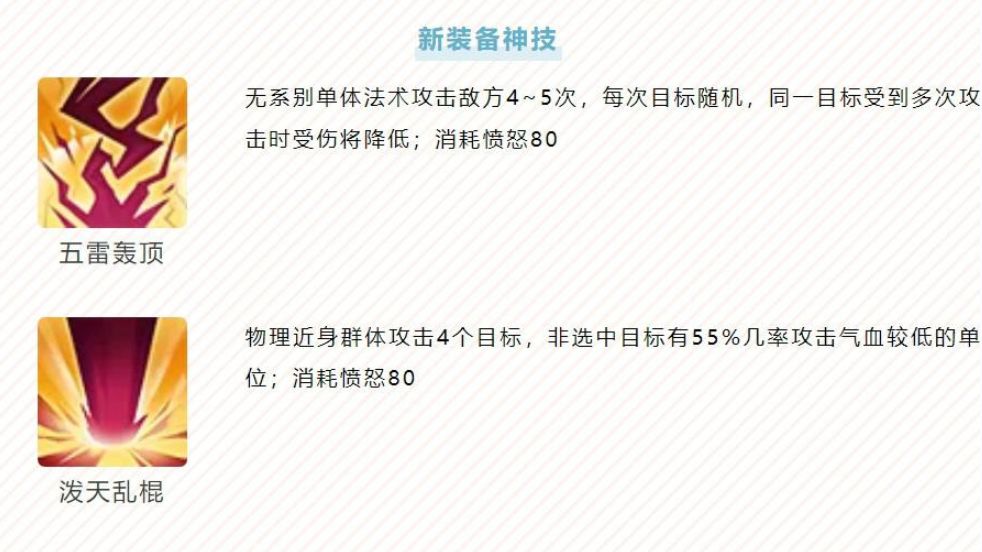 在“耗怒80”这一档,游戏里已经有了对单体的“嗜血连击”跟“烽火连城”,现在新增了两个群伤神技(“五雷”是单体,但也算群体技),伤害估计不会有多高,拿给输出压血线、守尸挺不错的。另外,对玩魔方寸、魔曜华的邪道玩家来说,要是打出来了也能拿来当个额外的输出手段。