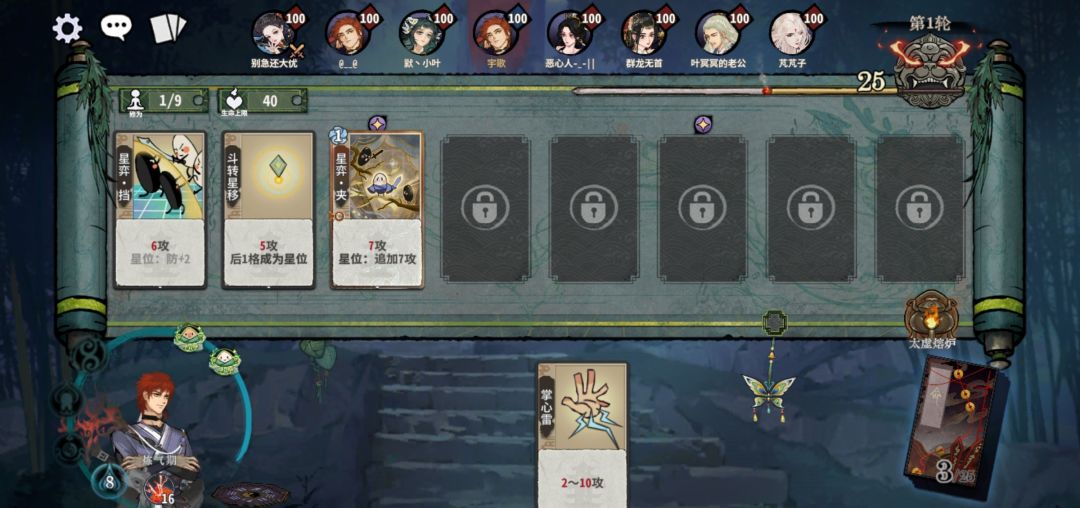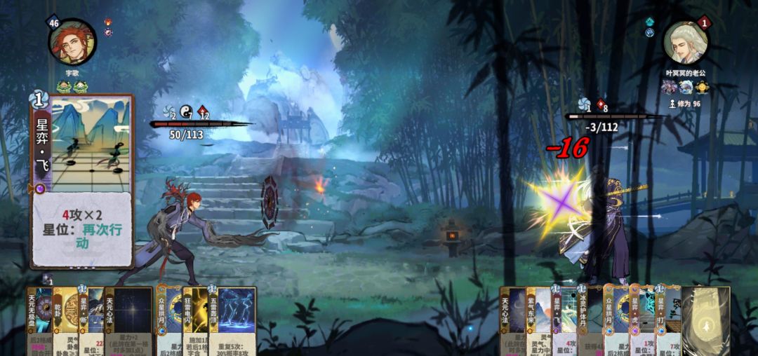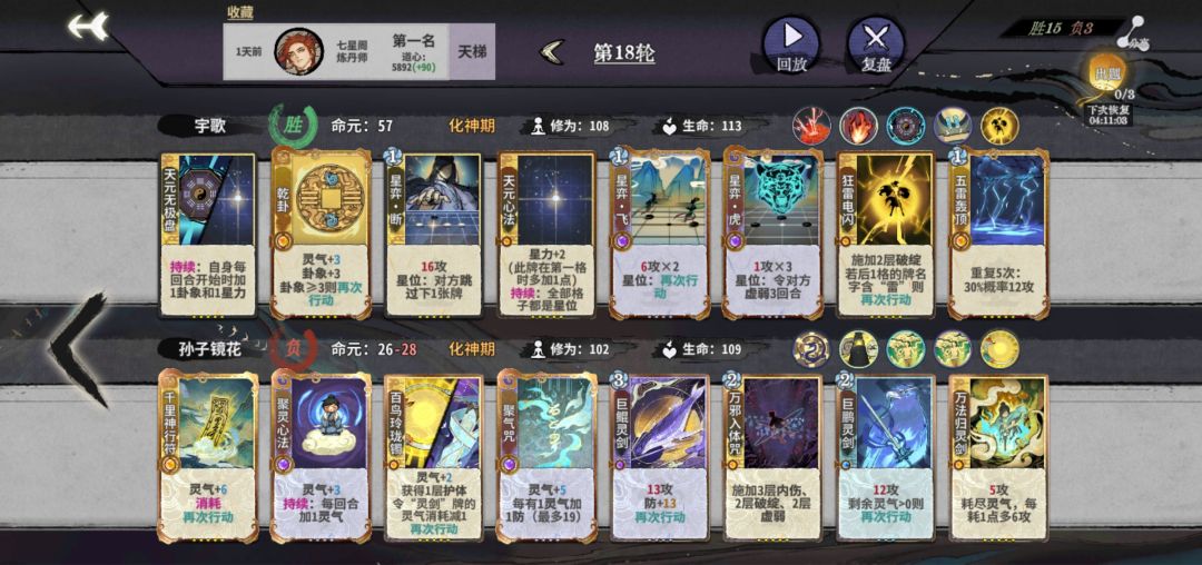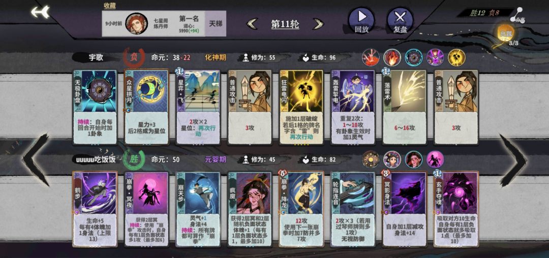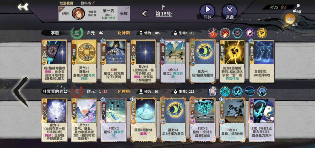 筑基开始,拼先手也拼质量,牌质量不行,先手也没用。这回合一定注意要留两个双击牌,不然亏星力攻击。公式中1、2位置看对面牌调整。