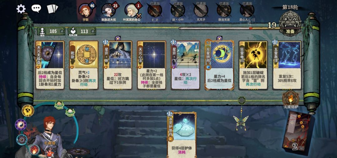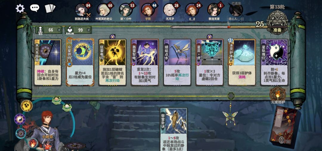 化神后,没有统一公式,通常推荐从护体雷过度到星雷,关键牌是天元心法和五雷轰顶,随便来一张就能战。其余留牌乾卦、断、众星、飞、蜻蜓、虎、护体丹,来就留着,哪怕用不上(也不能太死板,都要被送走了,抢修苟住最重要)。