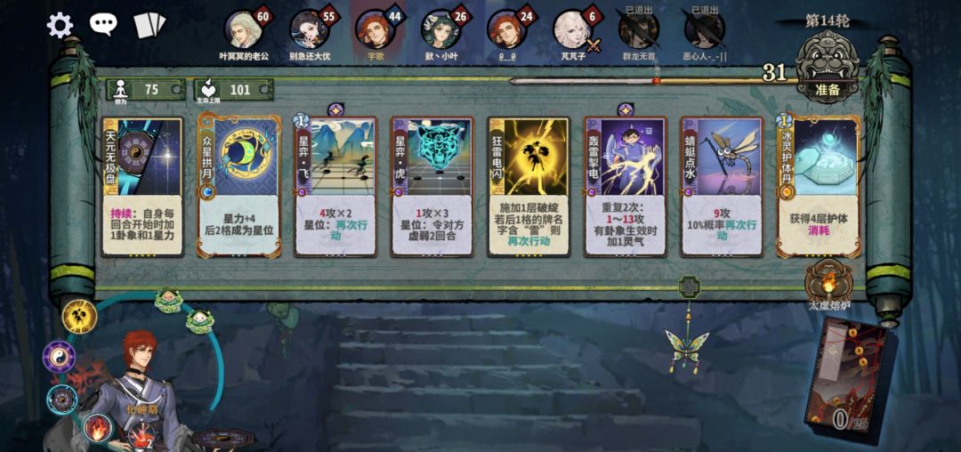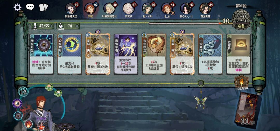 这套专克云剑、五行(除老虎)、七星阁,两动/三动“断”或“虎”视情切换。且无视虚弱,一般五动杀,对面有护体那就六动虎补杀。这也是我后面最常用的卡组,缺点就是组件需要较多,可以从护体雷过度成型。