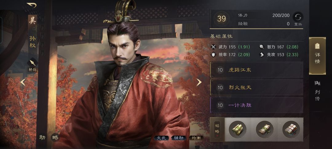孙权战法:孙权战法:虎踞江东+烈火张天+一计决胜。