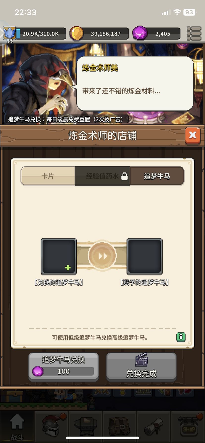 另外的话钻石虽然说不要乱花,前期可以酌情拉1-2次怪物十连抽,并且广告次数优先拉怪物,十连基本是保底1到多组s级碎片或者ss碎片,获取s碎片后可以到炼金术师处转化成ss级宠,ss级宠物推荐南瓜(pvp和追梦牛马公园会很厉害)还有bug人和老大辉煌灿烂也是很不错的。