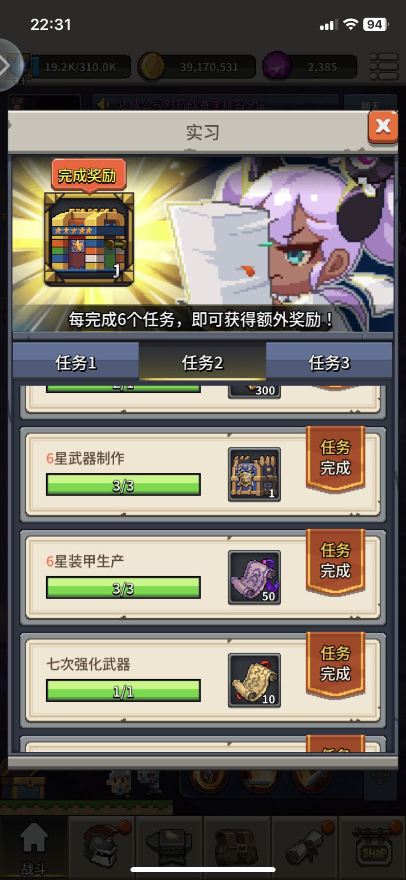 其次活动内实习区块有很多任务,按任务去做,可以获取1000万能碎片,这时候有玩家会问了,没资源任务做不完,首先散件获取从综合商店买满装备分解获得,每天中午凌晨分别刷新一次 也就是一天可以买十页装备,,第三页可以买装备箱子,都是获取装备的途径,实在做不完比如获取6星装备之类的,可以把已经做过的装备分解完重新合成,也是快速通过的办法之一,肝一点的话俩天9星是没有问题的。