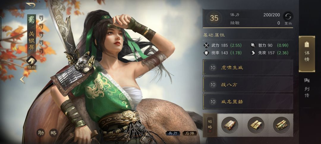 关银屏战法:虎啸生威+战八方+威名显赫。