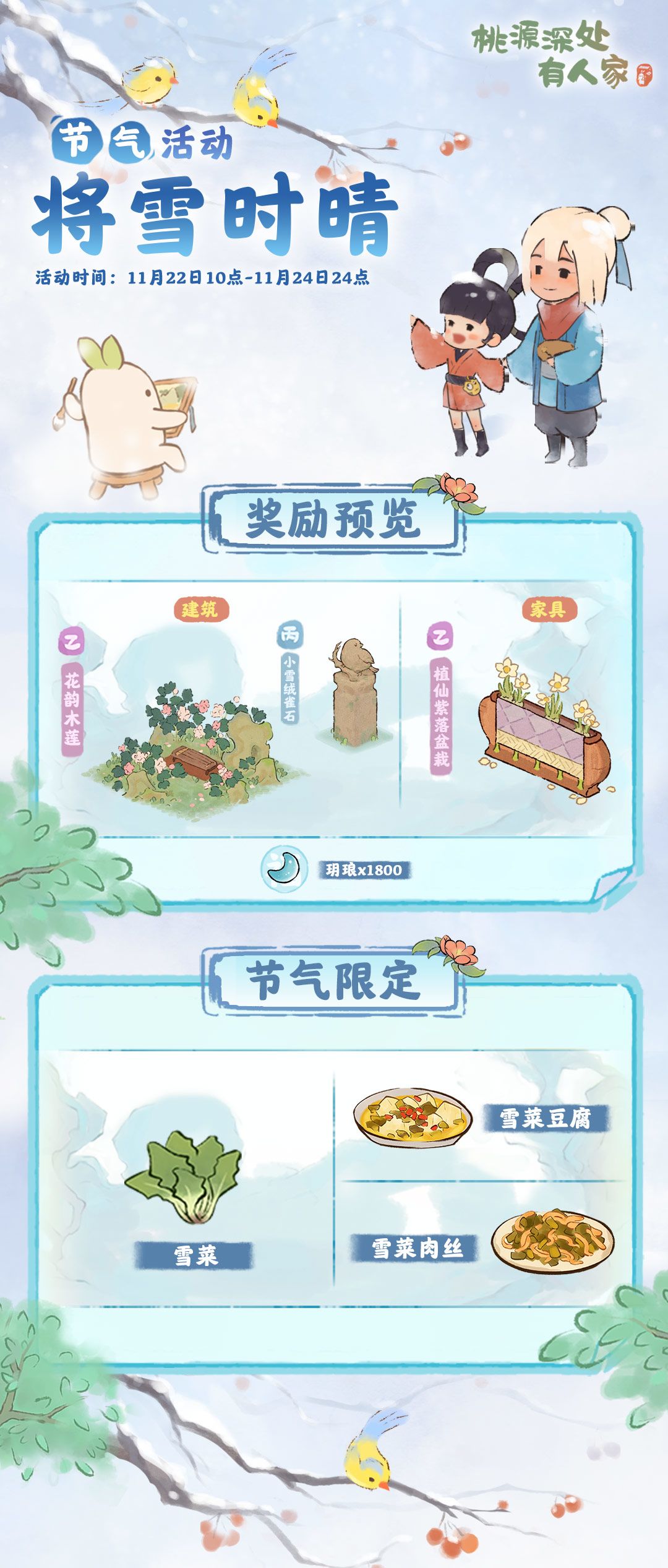 山民在活动期间内,可种植特殊农作物「雪菜」和制作特殊节气菜肴「雪菜豆腐」「雪菜肉丝」,提交节气订单可以额外获得玥琅。萝萝山已准备好了本期的节气限定建筑,山民记得参与活动获取玥琅,不要错过兑换时间萝♥萝卜小提示:水莲花尽木莲开,活动开启后山民们可以用节气限定建筑「花韵木莲」和节气限定家具「植仙紫落盆栽」来装扮萝萝山萝!