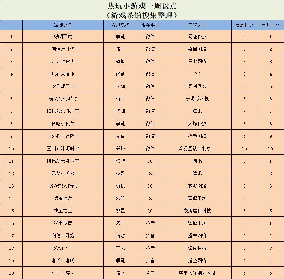 休闲新游周报每周统计微信小游戏、QQ小游戏、抖音小游戏、硬核小游戏以及App Store和Google Play上的新游爆款,并按照分类制作表格,将游戏排名情况等信息公布,希望给到行业同侪帮助。