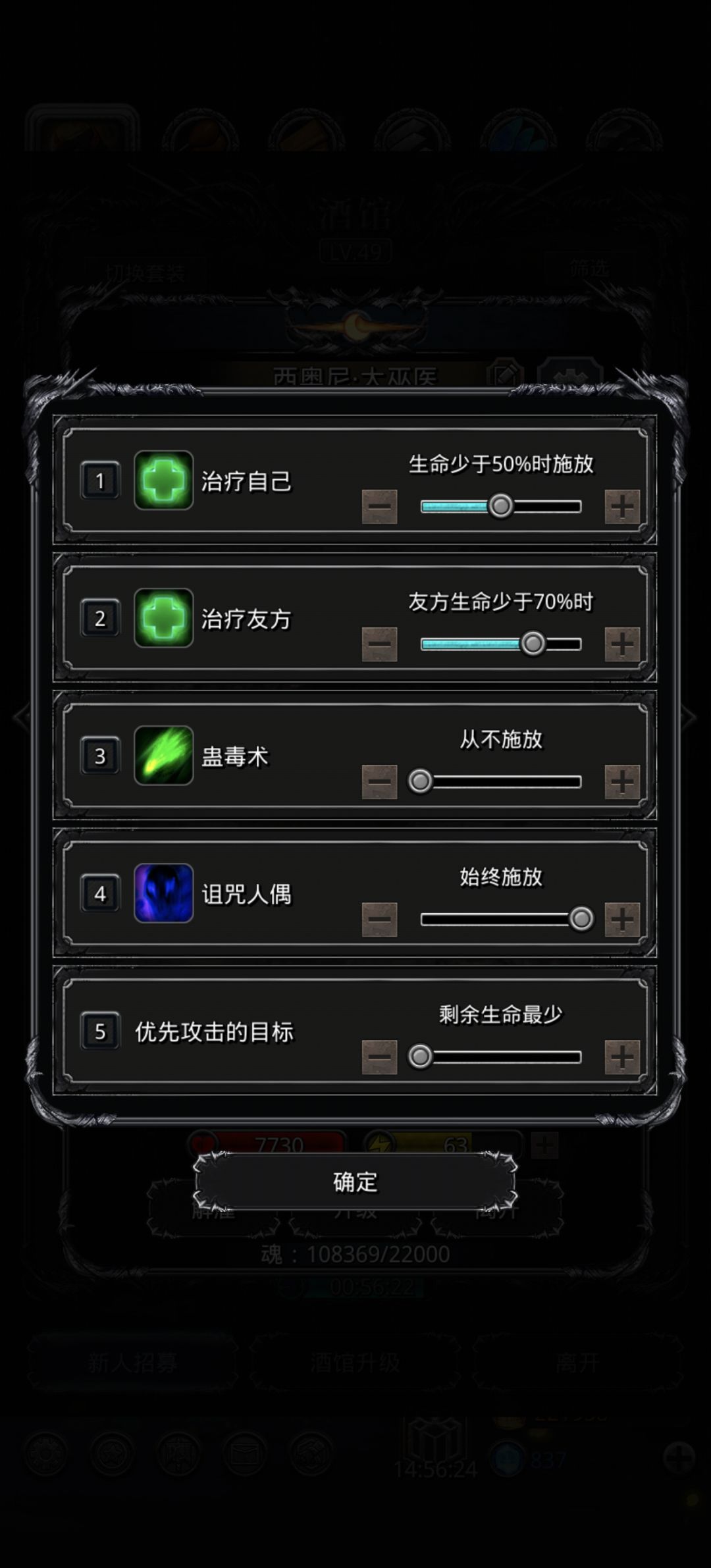 回春50/70 ,开毒开晕都无所谓,因为几乎没机会攻击