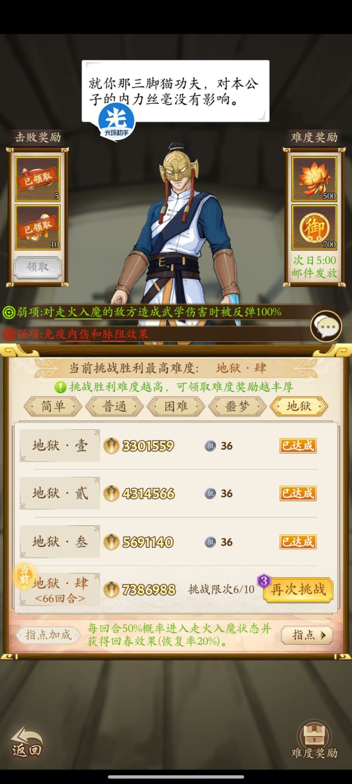 指点:阿牧,走火入魔。今天套路和昨天差异不大,因为不能吸内,第一套需根据自身情况换一套阳毒光明,整体相对简单一点,武学等级高得有机会地狱四。