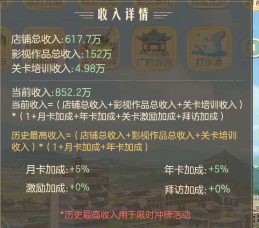 推关提升的收入其实没有升级店铺来的多,主要用途是获取阅历+解锁店铺,解锁新店铺的收入是很可观的,个人有一次榜单总提升量100万,新店铺解锁就有16万。故推关解锁的新店铺我们可以等收入榜再开业。