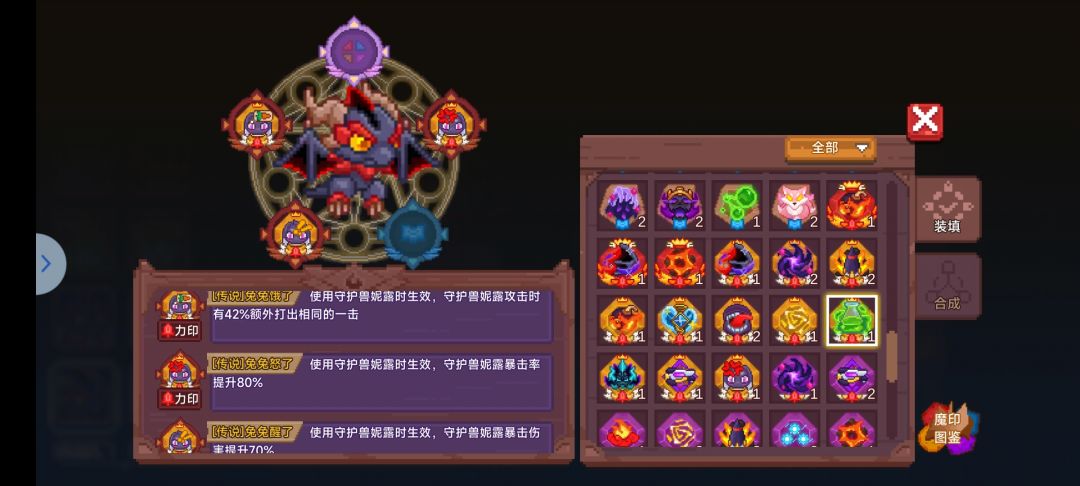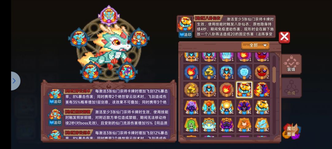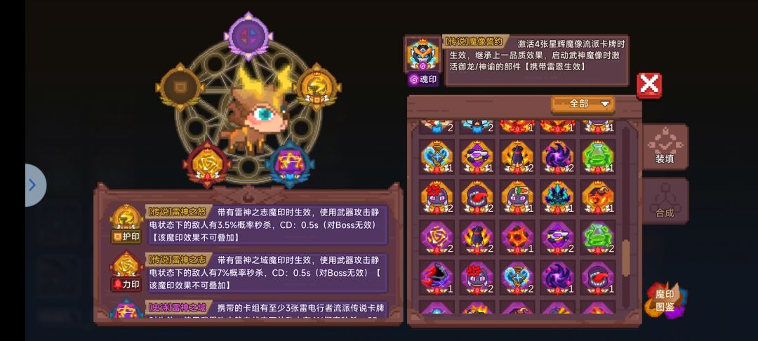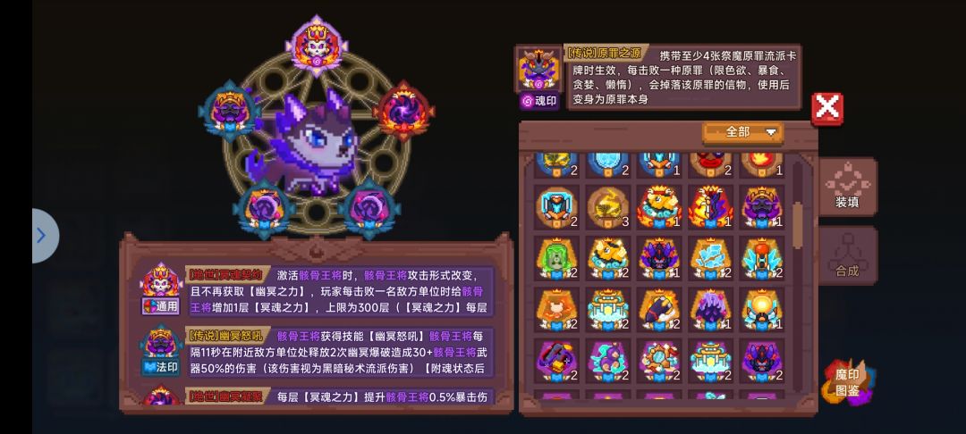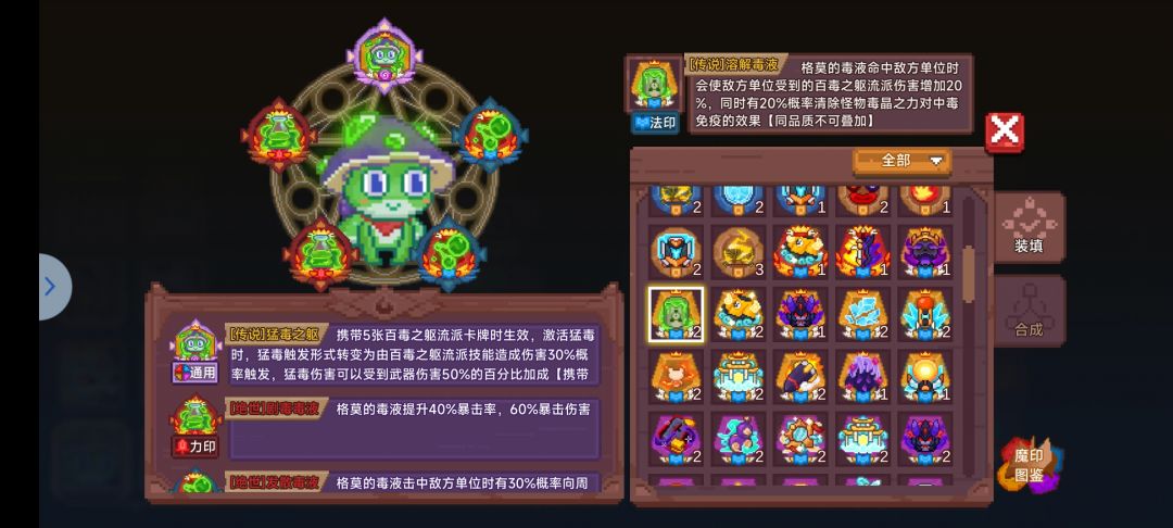 一个十分尴尬的流派,宠物数值不是很高,流派卡牌弱的离谱,因此跟兔子地位差不多,均为前期帮助无需魔印流派过渡使用,即便是33也很少带溶解毒液,或者直接在魂印位置放溶解毒液即可,不带魂印,如图携带印即可,多余的分解。