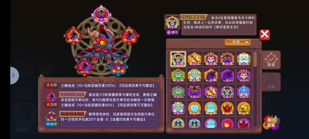 本篇主要是魔印的选择与保留,另外,魔印分别有魂印(紫色卡槽),法印(蓝色卡槽),力印(红色卡槽),护印(黄色卡槽),品质除了魂印都是白,蓝,紫,金,红,魂印只有后三个。