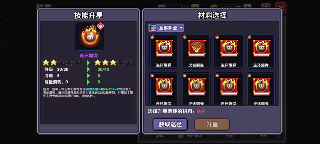 第一阶段:技能的强化通过添加技能卷轴获取经验,技能卷轴也有三种属性,同时又分大师、高级、中级、初级四种,分别提供625、250、100、50点经验,如果卷轴属性和所要升级的技能属性一致,则多获取20%经验。在第一阶段时,技能每强化10级需要升星一次,升星需要消耗同属性且同品质的技能书,技能升星消耗如下: