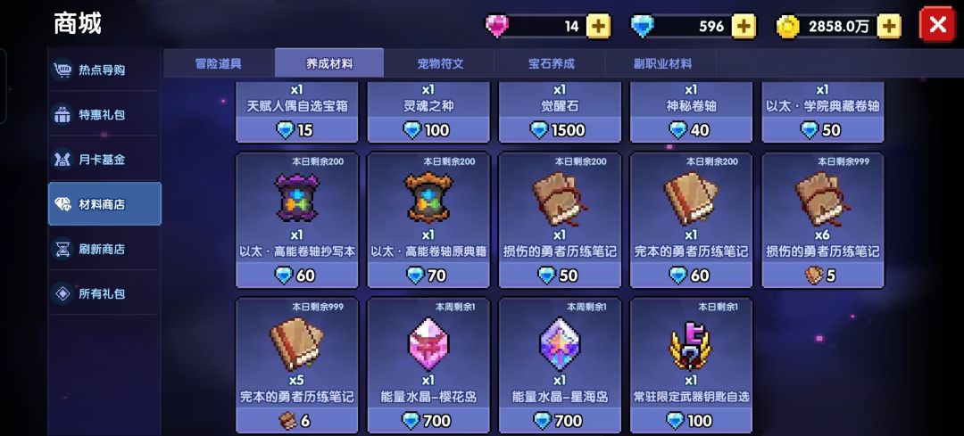 技能突破给的加成很大,而且资源获取途径少,兑换的优先级很高。另外,魔神石稀有属性的强化技能词条、魔女外装的套装效果也可以提升魔女技能的等级。刷新商店除了最新的魔女技能,其他都可以刷出来,初见魔女的技能可以用金币买,其他的用钻石。