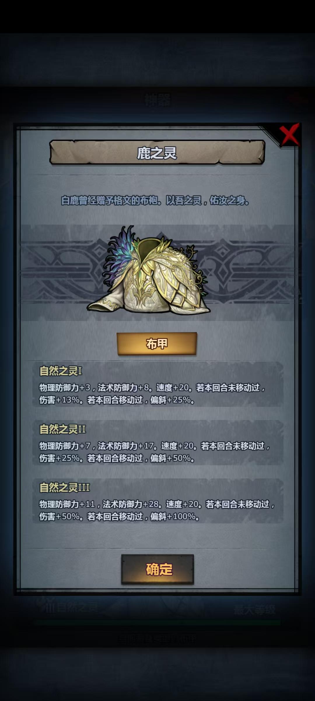 移动力加1确实非常吃香,但是不排除队伍有布甲物理,当然,如果没有用移动甲也是非常不错的。至于黑甲和鹿灵,我个人更推荐鹿灵,增伤稳定,并且带有偏斜,还可以和法拉圣物配合,基本上三级法拉圣物配合三级鹿灵所带来的增伤有: