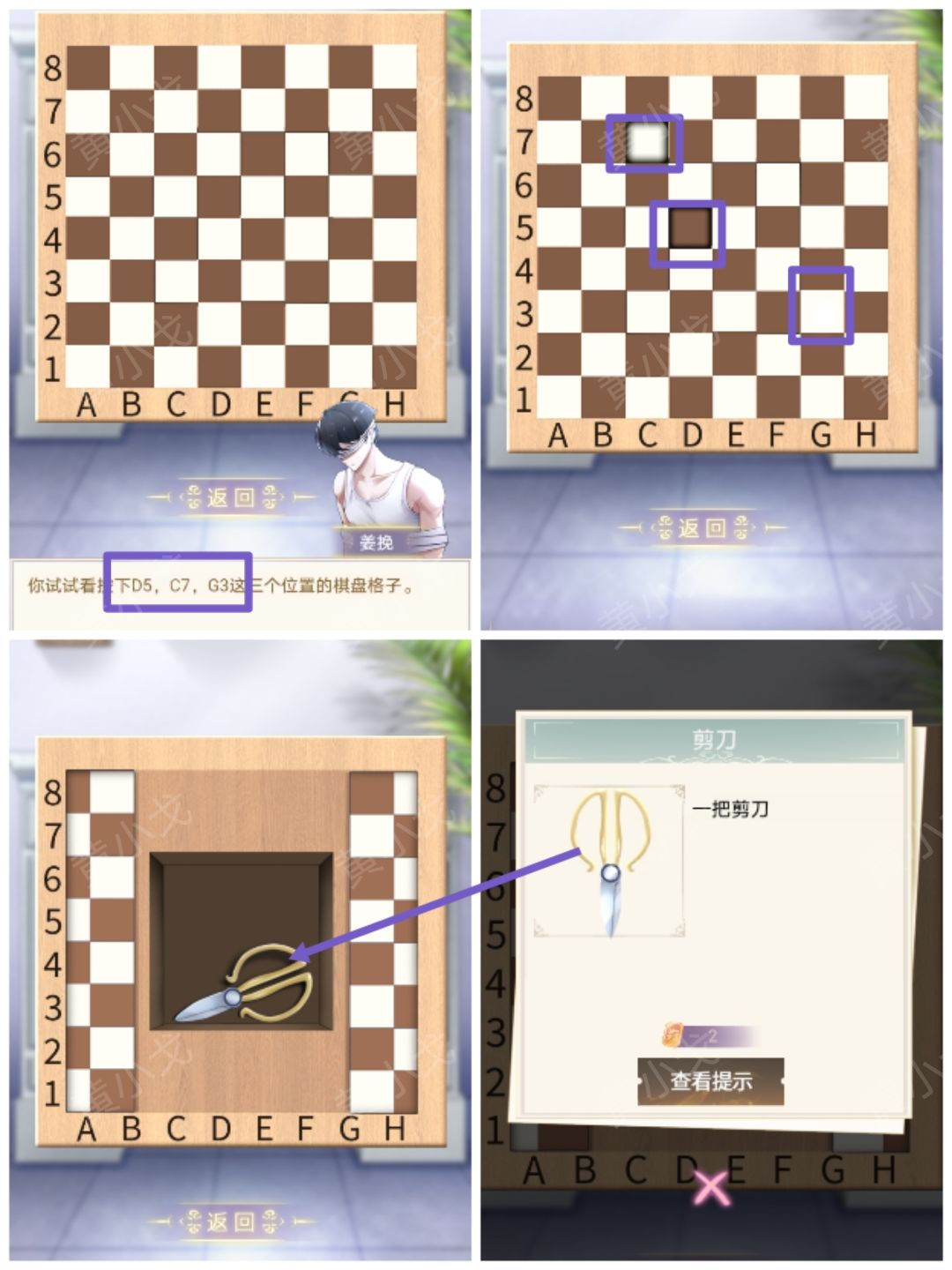 1.点击壁炉上方的棋盘,根据对话,按下D5,C7,G3三个位置;打开暗格,获得【剪刀】