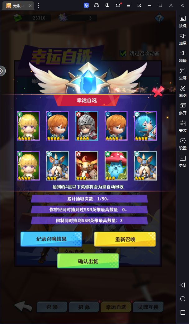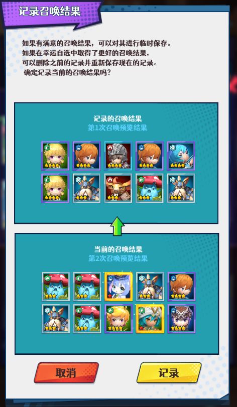 幸运自选其实可以理解为50次10连召唤,然后在其中挑选一次最满意的结果。具体操作就是,抽到心仪的结果(暗射/暗骑/光奶/冰法),点击记录,暂时保留,然后继续抽卡,直到更优的结果出现,再记录结果,注意,会覆盖上一次记录。