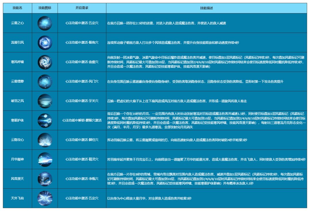 寒霜护体:背后召唤一个存在10秒的月亮,一定范围内有敌人时自动发射寒流对目标造成魔法伤害并减速1.5秒,同时使目标叠加1层风霜标记(风霜标记持续3秒,每次叠加风霜标记可刷新持续时间,风霜标记最大可叠加到10层,当风霜标记叠加到2/4/6/8/10层时风霜标记持续时间结束会使目标速度降低同时魔抗降低持续3秒,并且会造成一次魔法伤害,风霜标记受技能寒风呼啸、技能风雪漫天影响),每射出三道寒流月亮形态变化一次(满月,半月,月牙)最多九道寒流,全部发射完月亮消失