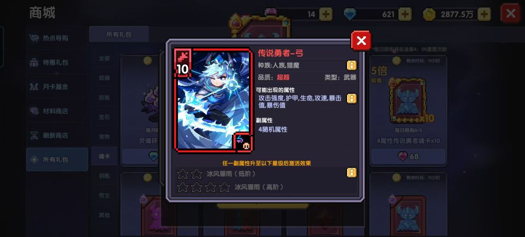 6.传说勇者-弓:攻击敌人未暴击时,增加5暴击值,最多10层;暴击时有20%概率使敌人获得【骤雨】,受到来自你的全属性伤害加24%。