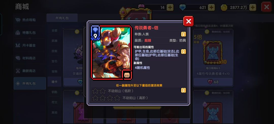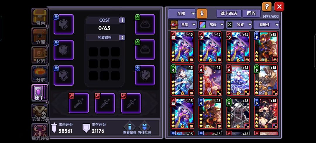 灰色部位的种族:每张魂卡都有对应的种族,与游戏内角色的设定相匹配。目前共有不死族、魔物、亚人、元素、恶魔、人族、魔神、猎魔、堕天使共计9个种族,不同种族凑齐所需的魂卡数后可以激活对应的种族羁绊(见图6)。品质:魂卡的品质和武器一样分为普通、稀有、史诗、传说、超越共5级,品质越高的魂卡占据的COST也越多。类型:代表该魂卡所属的部位,开头已经讲过,不再赘述。主属性:在获得每张魂卡时,会随机一条主属性,数值固定仅与魂卡等级有关。不同类型的魂卡能随机出的主属性不同,一般推荐:武器卡拿暴伤,饰品卡拿元穿,防具卡拿此部位基础[攻击]+xx%。