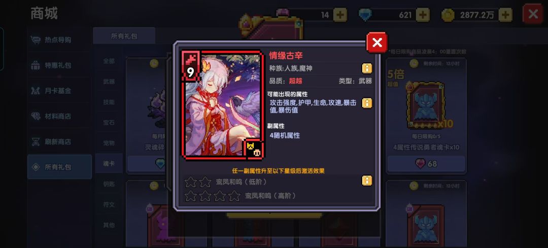 副属性:在获得魂卡时,随机获得1-4条副属性,词条也完全随机,而同种词条对应的数值也是随机的,副属性不随魂卡等级的提升而提升,只随该词条后边星级的多少而增加。星级效果:每张魂卡都有对应的星级效果,在魂卡星级达到对应的等级后将解锁该星级效果。