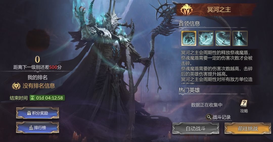 每个首领都有独特的技能配置及特性,我们可以基于首领特性选择适配的队伍进行挑战。初期大家都比较缺英雄,所以用主力队打即可,后期要基于首领类型选择适配的英雄(便于我们争夺排名)。