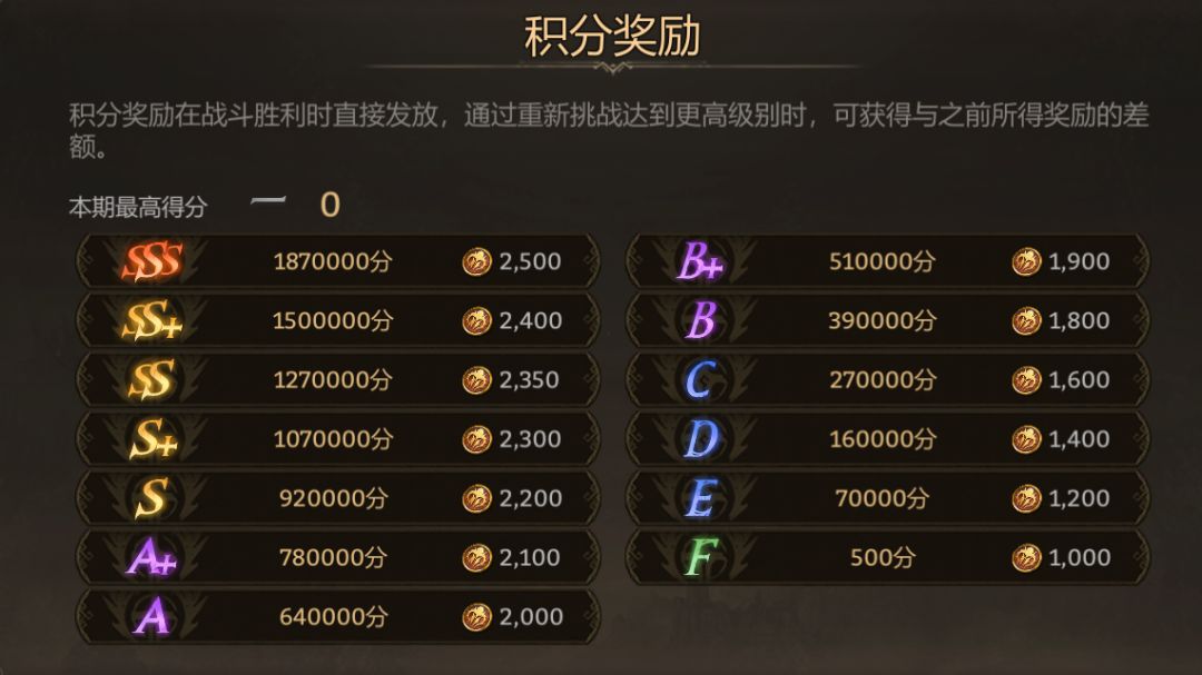 在“Boss Rush”阶段,可根据伤害表现获得阶段奖励;积分奖励可以在战斗胜利后直接发放,主要是根据评分发放相应数量的首领之徽,建议尽量获得A以上评分,D-F的奖励内容比较少。