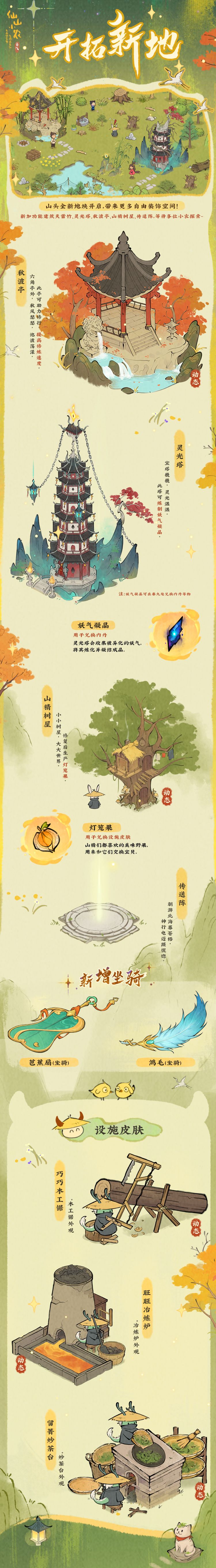 新增设施皮肤「巧巧木工锯」、「旺旺冶炼炉」和「留菁炒茶台」,可在后山小山精处使用灯笼果兑换。