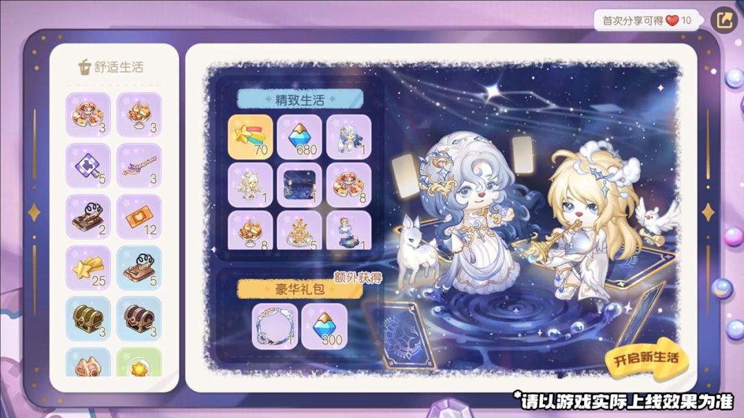 豪华生活:活动周期内,升级解锁豪华生活礼包,除享有精致生活礼包相同权益外,还立即赠送礼包等级20级、专属头像框「审判之月」、300晶钻福利,享有每日备忘经验20%加成。(若已购买精致礼包,升级豪华礼包时赠送礼包等级为10级)