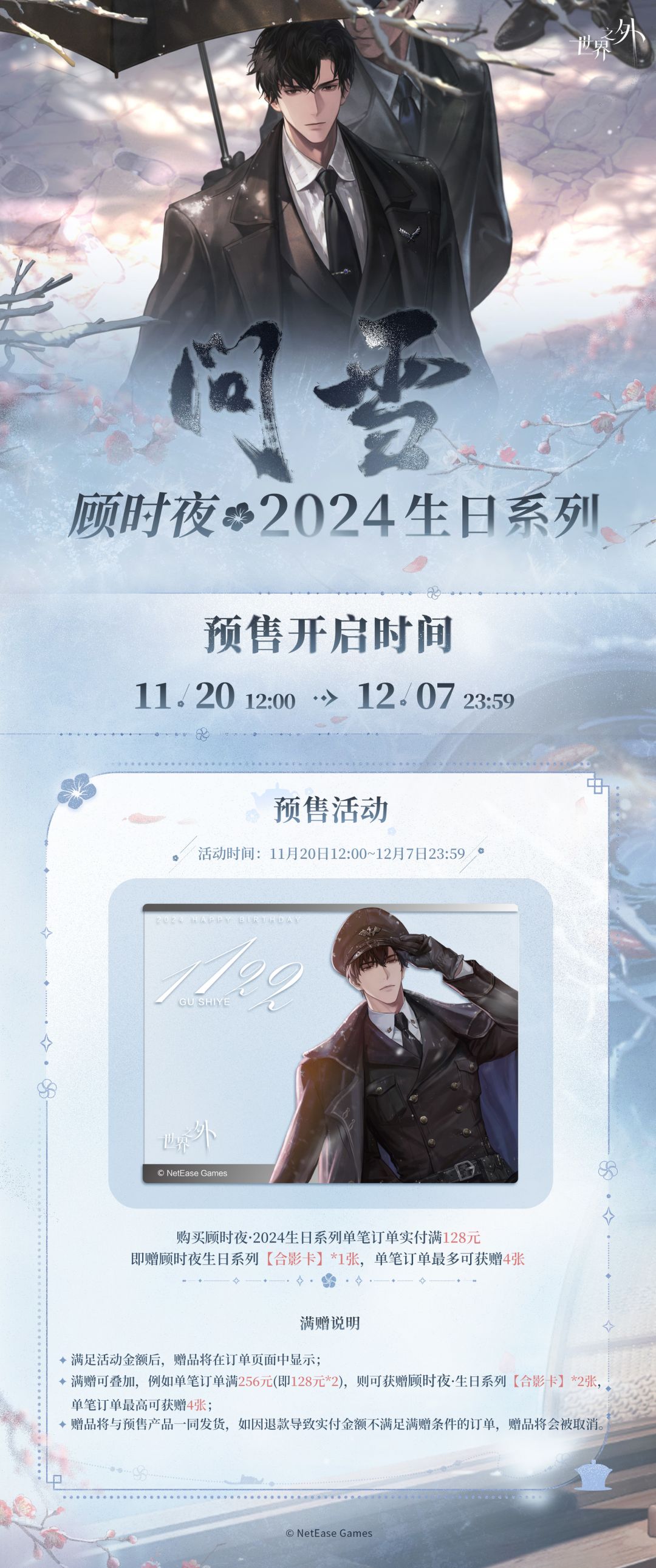 购买顾时夜 ʃ☆2024问雪系列单笔订单实付满128元,即赠问雪系列「合影卡」*1张,单笔订单最多可获赠4张;