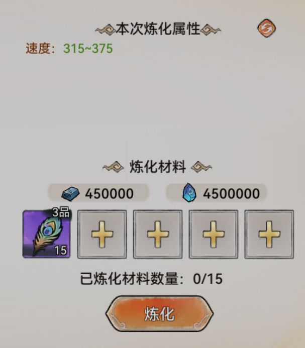 15个羽毛,炼化出来苜蓿在携带双木阵的情况下,速度一般能达到3800左右,如果不想要太多速度的话,可以炼化5个左右的生命值(木头),7个左右的治疗效果(火花)。