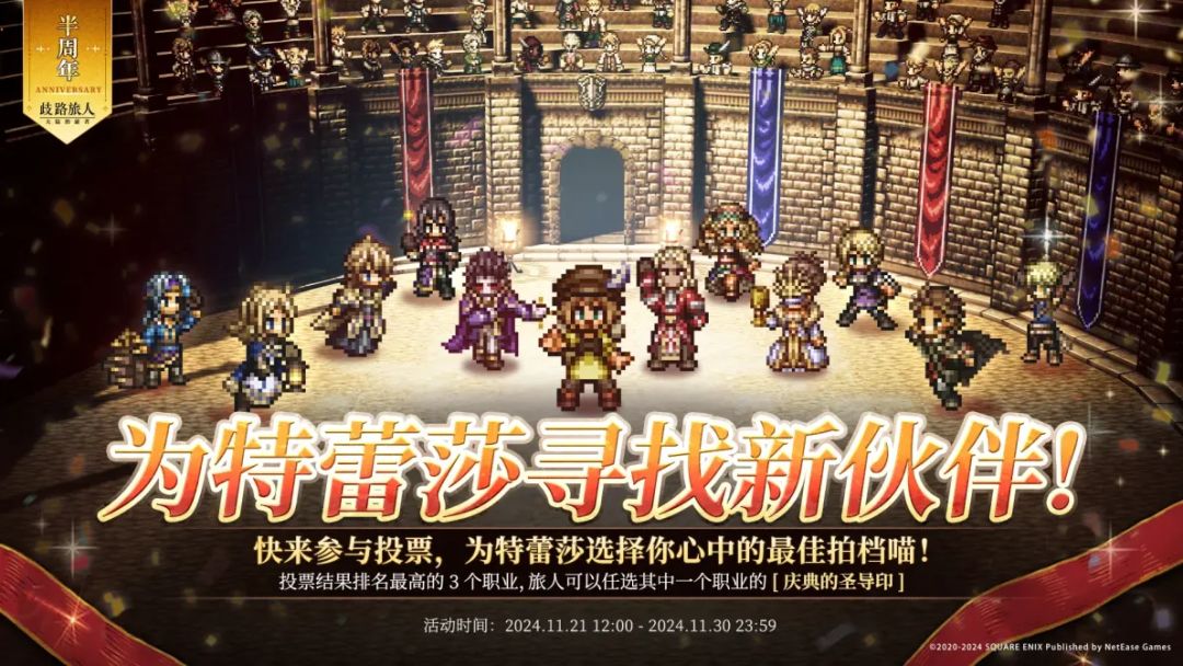 投票结束后,旅人们可以从排名最高的3个职业中任选1个职业的“庆典的圣导印”。使用对应职业的“庆典的圣导印”可随机获得一个该职业的5★旅人!可获得的角色范围,及其他活动细节可待活动开启后前往投票活动页面查看。投票时间:2024年11月21日12:00~2024年11月30日23:59奖励发放:庆典的圣导印奖励将于12月上旬发放,敬请关注后续版本更新公告。