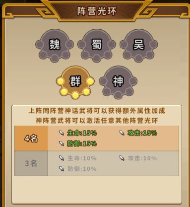 配队时可考虑上3/4名同阵营武将,触发属性增益~